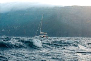 on Yacht catamaran in the stormy ocean near the island of La Gomera.
