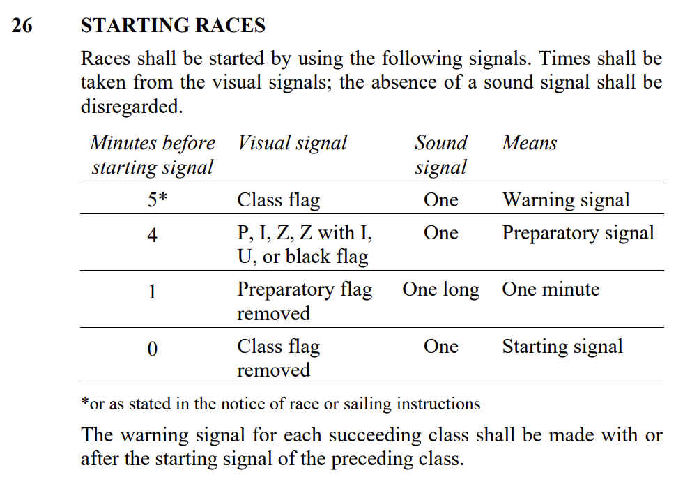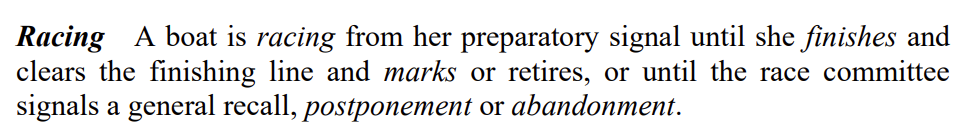 Above is the exact start sequence as defined in the current RRS (Racing Rules of Sailing, 2025-2028). And below, we have the definition of when a boat is racing.