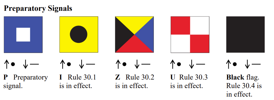 Besides the P flag, the race committee may hoist additional Preparatory flags including I, Z, U, and a black flag. These invoke specific rules about what happens to boats which are over the start line early, and how the start line is handled in the last minute of the start sequence.