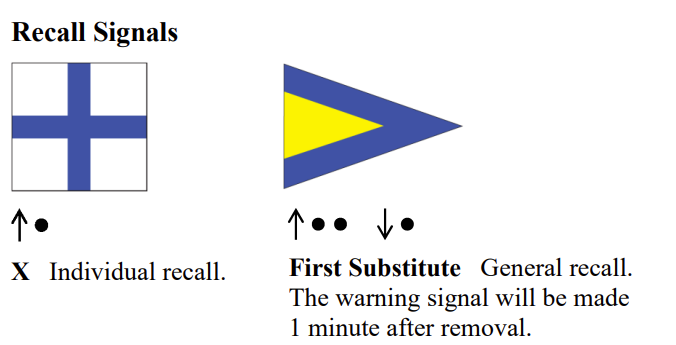 Individual Recall – if the race committee flies an X flag and makes a sound, that indicates that at least one boat was over the start early (known as OCS, or “On the Course Side” at the start), and is recalled. Note that the race committee is not obligated to state which boats are over early; it’s up to the skippers to know it was them. However, some committees may opt to read sail numbers over the radio or shout them to passing boats. But they are not required to; they will normally just leave the X flag until all OCS boats have started again.
